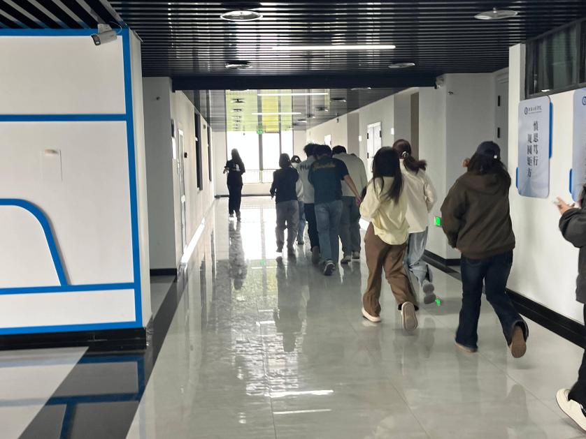本次演练设置应急疏散逃生、消防实操实训两个环节。疏散演练环节模拟实验室突发火灾实景,随着应急警报响起,全体人员在现场工作人员的统一指挥引导下,严格遵守消防安全规范,捂住口鼻、弯腰俯身,沿既定疏散路线快速有序撤离,安全抵达指定集结区域,整个撤离过程组织严密、行动规范、衔接顺畅,高效完成应急疏散演练任务。